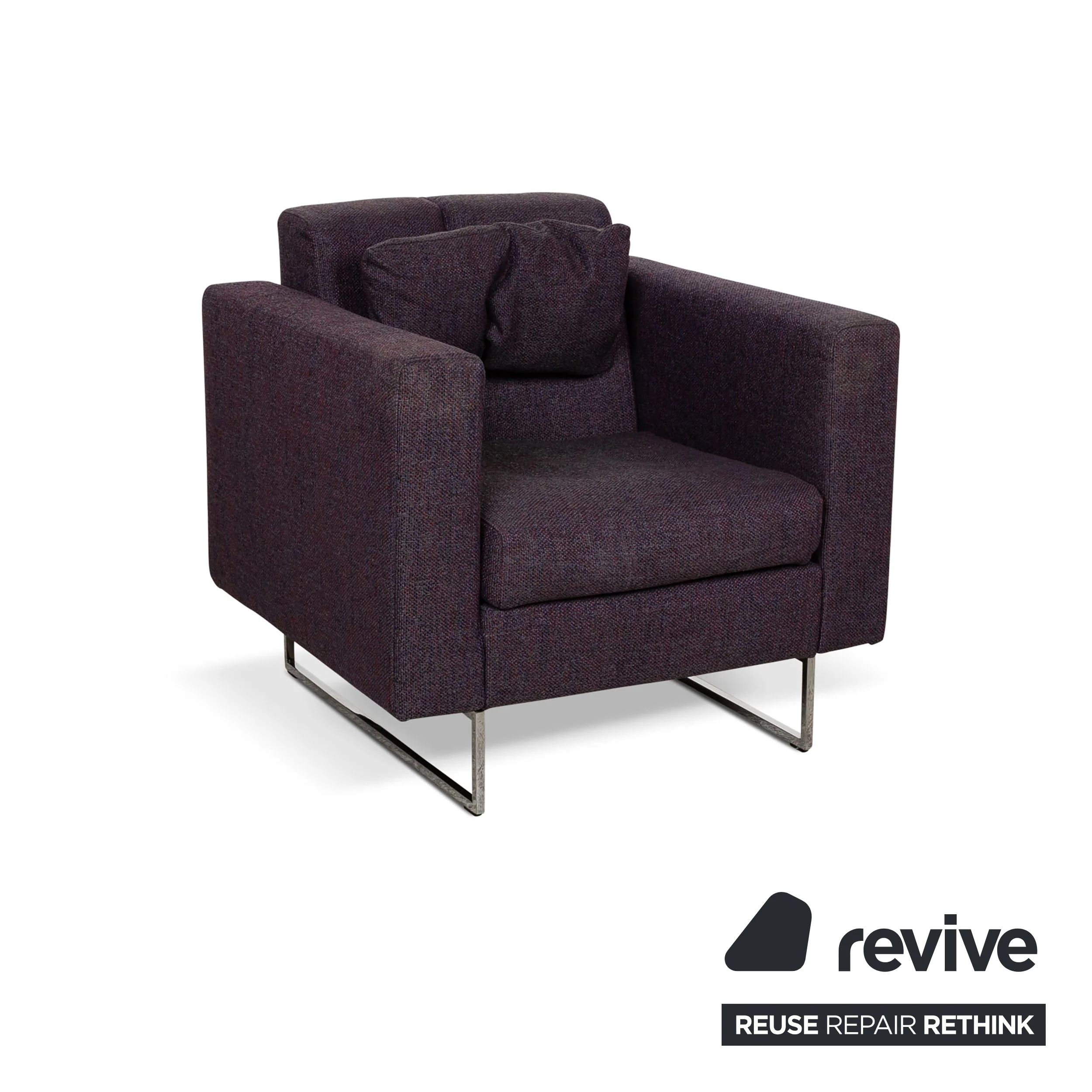 Der Sessel Embrace von Brühl überzeugt durch sein geometrisches, schlankes Design. Er ist mit einem lilafarbenen Stoff bezogen und steht auf eleganten Metallbeinen. Außerdem verfügt er über eine in der Höhe verstellbaren Rückenlehne.