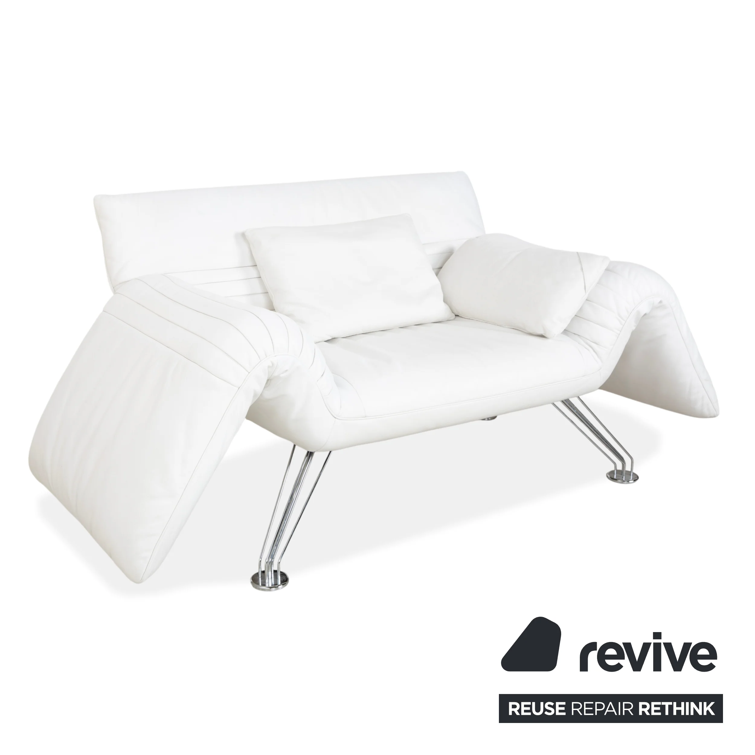 Der Bezug aus hochwertigem Leder ist in einem strahlenden Weiß gehalten, was die futuristische, organische Formgebung perfekt zur Geltung bringt. Das absolute Highlight ist die namensgebende „Wing“-Funktion: Rücken und Armlehnen sind nicht starr, sondern lassen sich unabhängig voneinander verstellen. Auf dem Bild sind die seitlichen Flügel weit nach unten geklappt, wodurch eine offene, breite Liegefläche entsteht. Man kann sie jedoch stufenweise nach oben ratschen, um eine gemütliche Kuhle zum Sitzen oder Anlehnen zu formen.