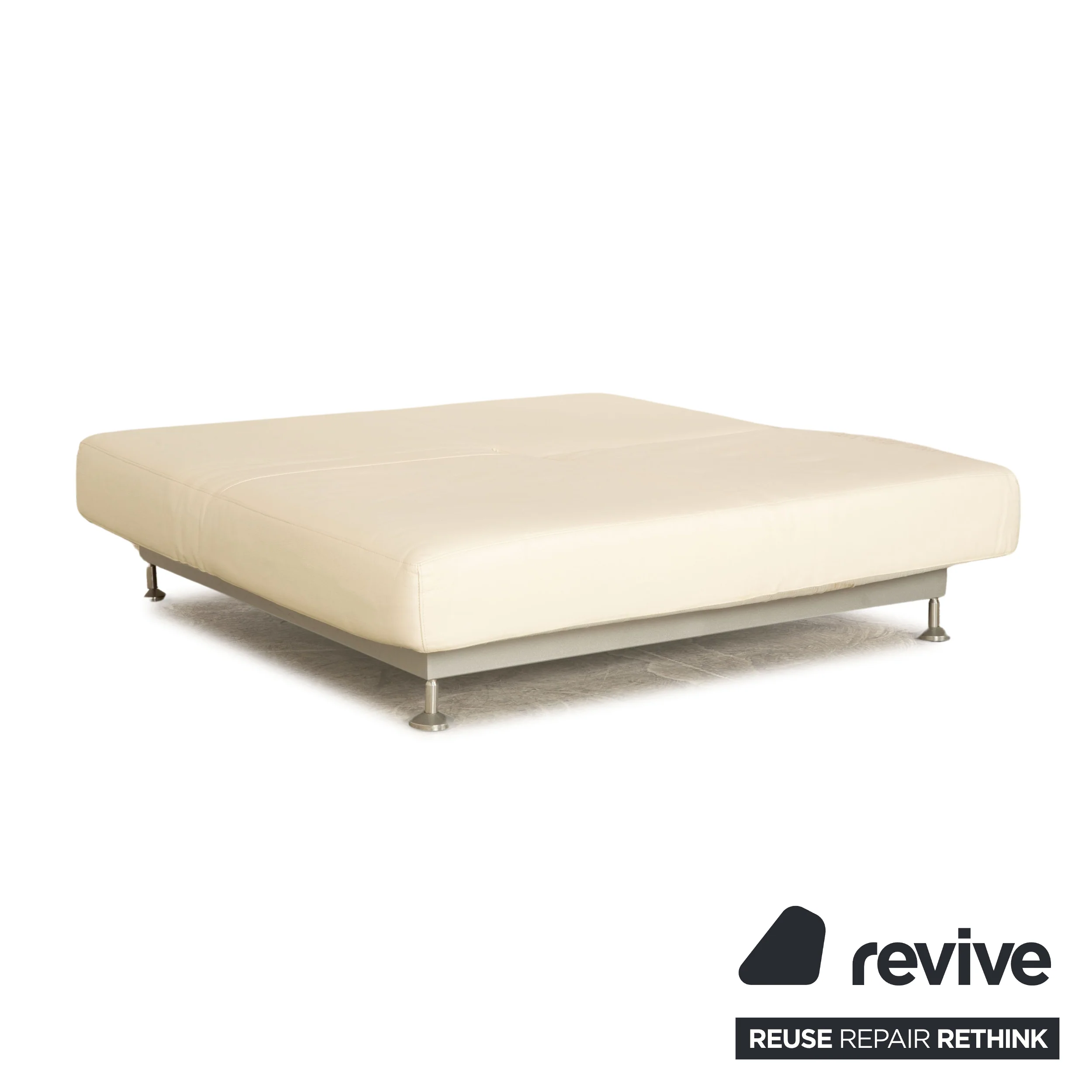 Der Zweisitzer Damier von Edra ist mit einem cremefarbenen Echtleder bezogen und steht einem silbernen Metallgestell. Er zeichnet sich durch die komfortable Schlaffunktion und das helle, harmonische Design aus.
